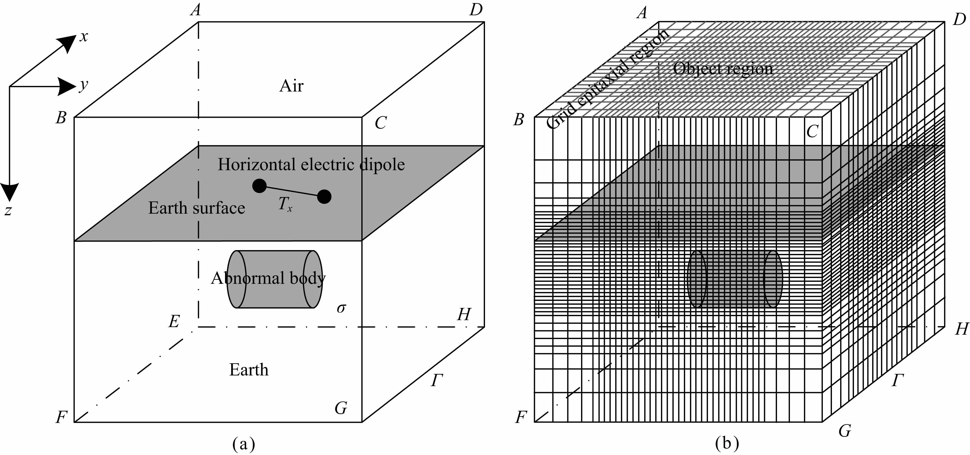 考虑如图 1a所示的三维地电模型,全空间由空气、异常体和大地组成,电导率σ是空间任意点的函数,任意方向的水平电偶极子源置于地表的任意位置. 假定大地中的磁导率和介电常数与自由空间磁导率μ和空气介电常数ε相同,取时谐因子e-iωt.根据电磁场理论,三维地电模型中任意点的电场强度E和磁场强度H满足如下的麦克斯韦方程式: