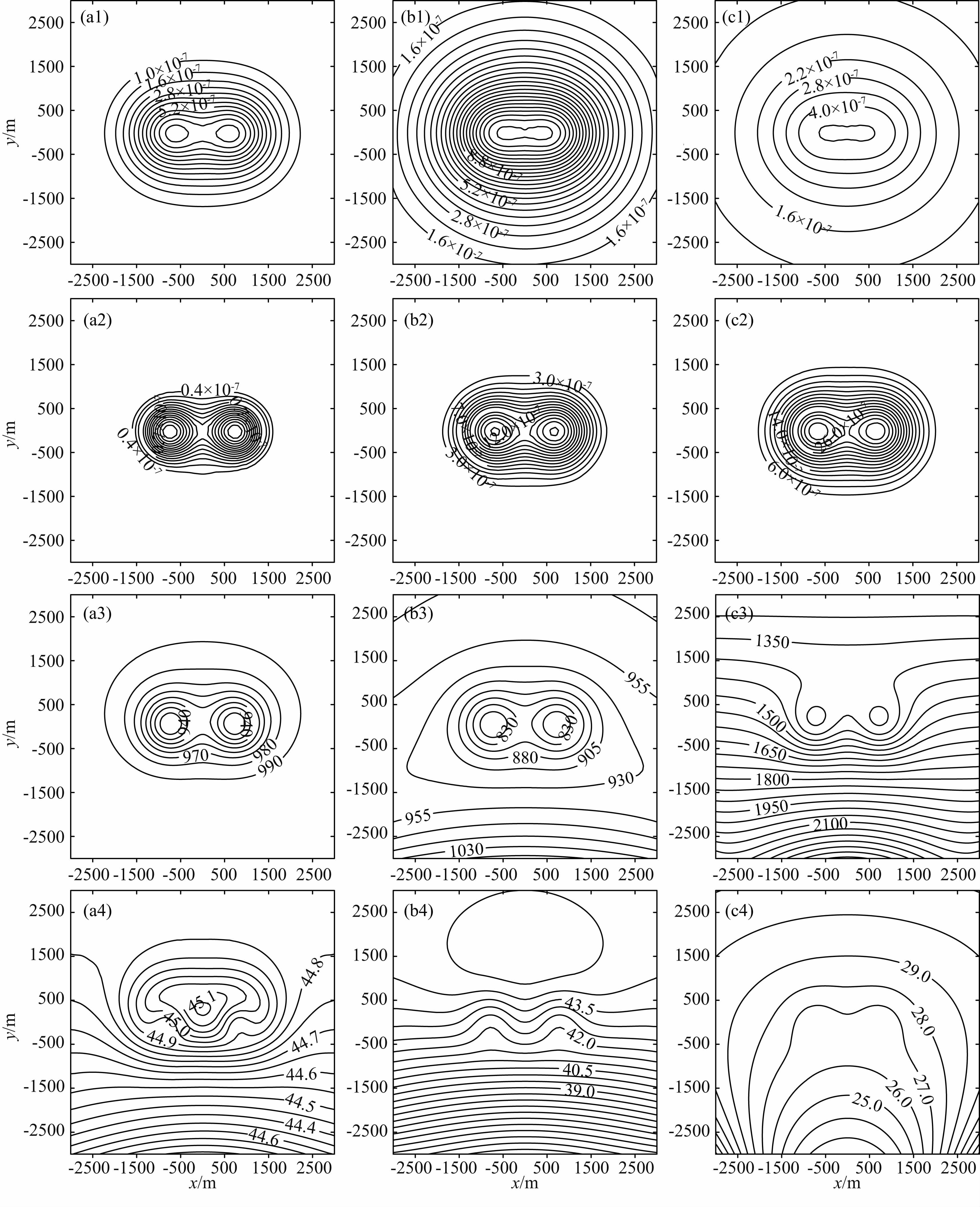 图 10 两个三维异常体模型不同频率地表二次电磁场、视电阻率和相位等值线图 (a1)、(a2)、(a3)和(a4)分别为1024Hz地表二次电场振幅、二次磁场振幅、视电阻率和相位; (b1)、(b2)、(b3)和(b4)分别为128Hz地表二次电场振幅、二次磁场振幅、视电阻率和相位; (c1)、(c2)、(c3)和(c4)分别为16Hz地表二次电场振幅、二次磁场振幅、视电阻率和相位. Fig. 10 Contour plot of the secondary fields,apparent resistivities and phases with different frequencies on the ground for the model with two 3D anomaly bodies Fig.(a1),(a2),(a3) and (a4)show the amplitudes of the secondary electric and magnetic fields,the apparent resistivity and phase at 1000Hz on the surface,respectively; Fig.(b1),(b2),(b3) and (b4)show the amplitudes of the secondary electric and magnetic fields,the apparent resistivity and phase at 128Hz on the surface,respectively; Fig.(c1),(c2),(c3) and (c4)show the amplitudes of the secondary electric and magnetic fields,the apparent resistivity and phase at 16Hz on the surface,respectively. |