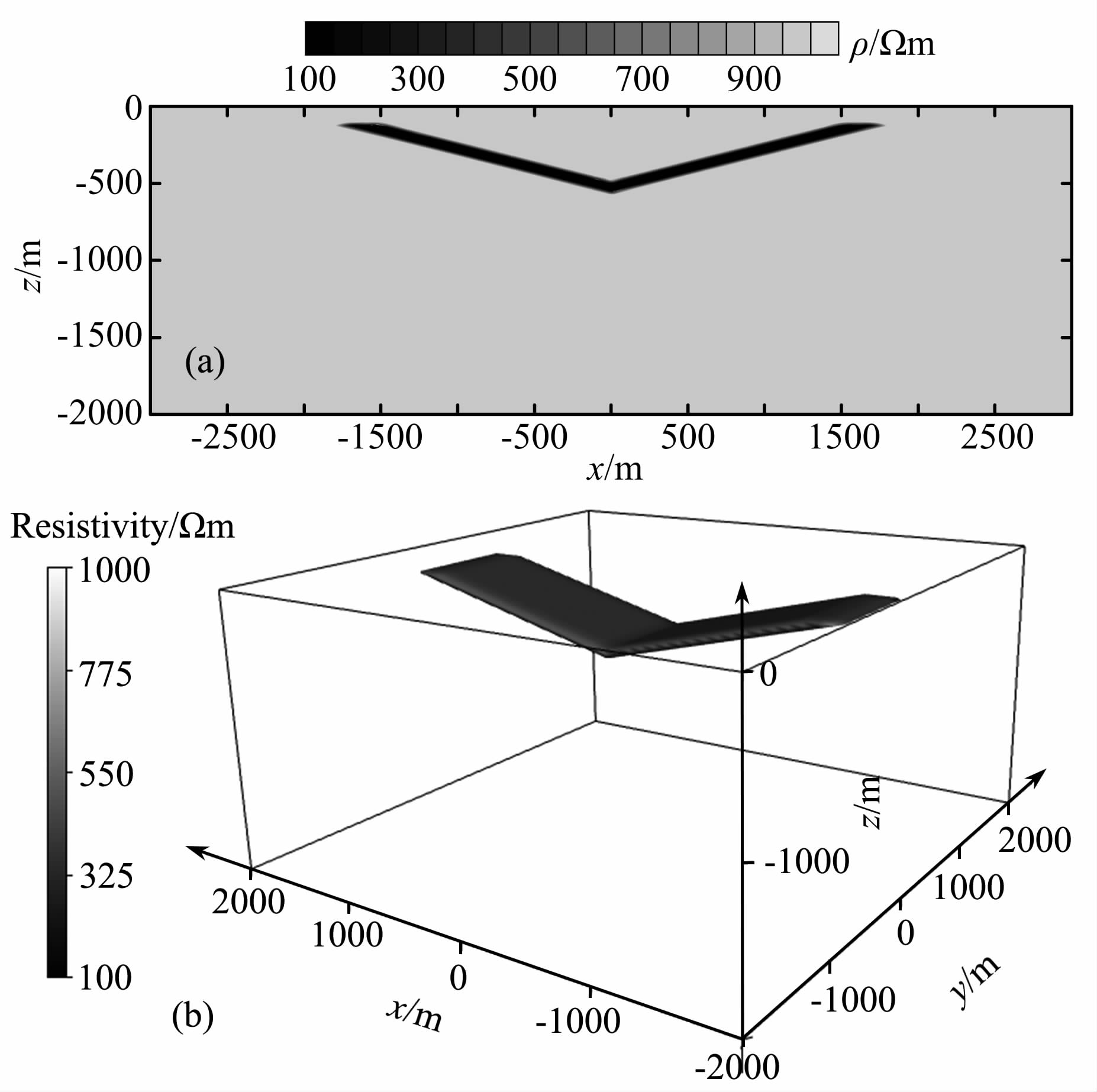 图 11 与周边电性渐变的V字型异常体模型示意图 (a)断面图;(b)电阻率分布图. Fig. 11 Schematic diagram for anomaly body shaped as V and continuous variation of electrical conductivity is shown around it. (a)Section view;(b)The spatial distribution of resistivity. |