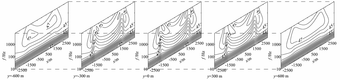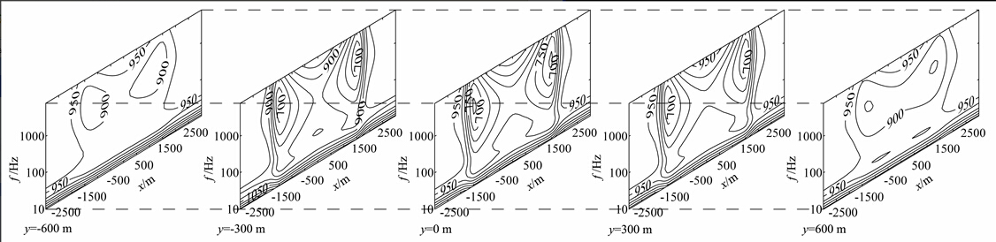 图 11和图 12分别是地表不同剖面y=-600 m、 -300、0、300 m和600 m的视电阻率等值线图和相位等值线图,纵坐标为频率,横坐标x为测点坐标,测点间距100 m,x=-3000~3000 m.由图 12和图 13可以看出,视电阻率和相位等值线很好地反应了“V”字型异常形态.
