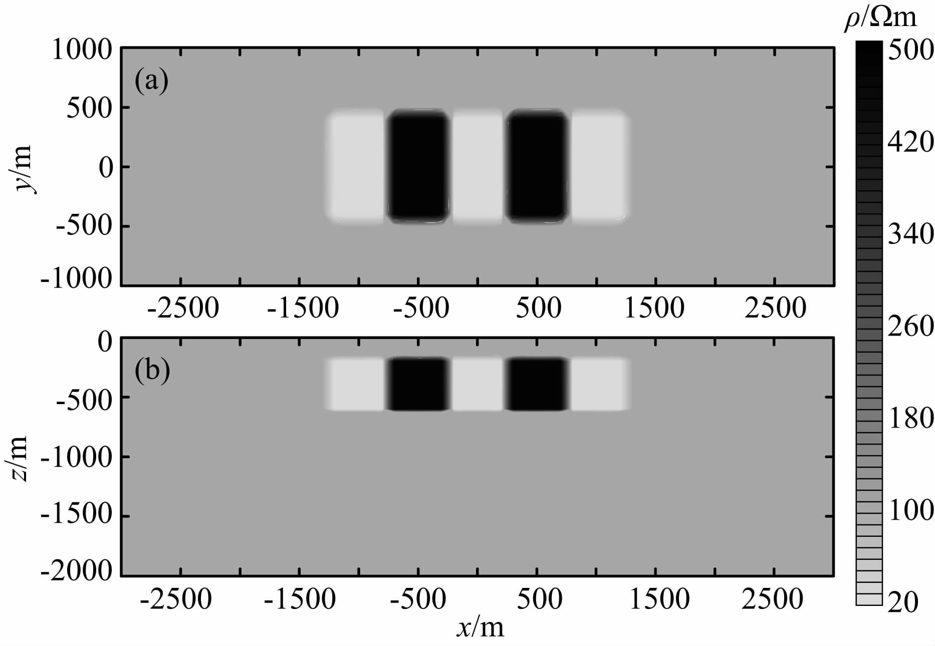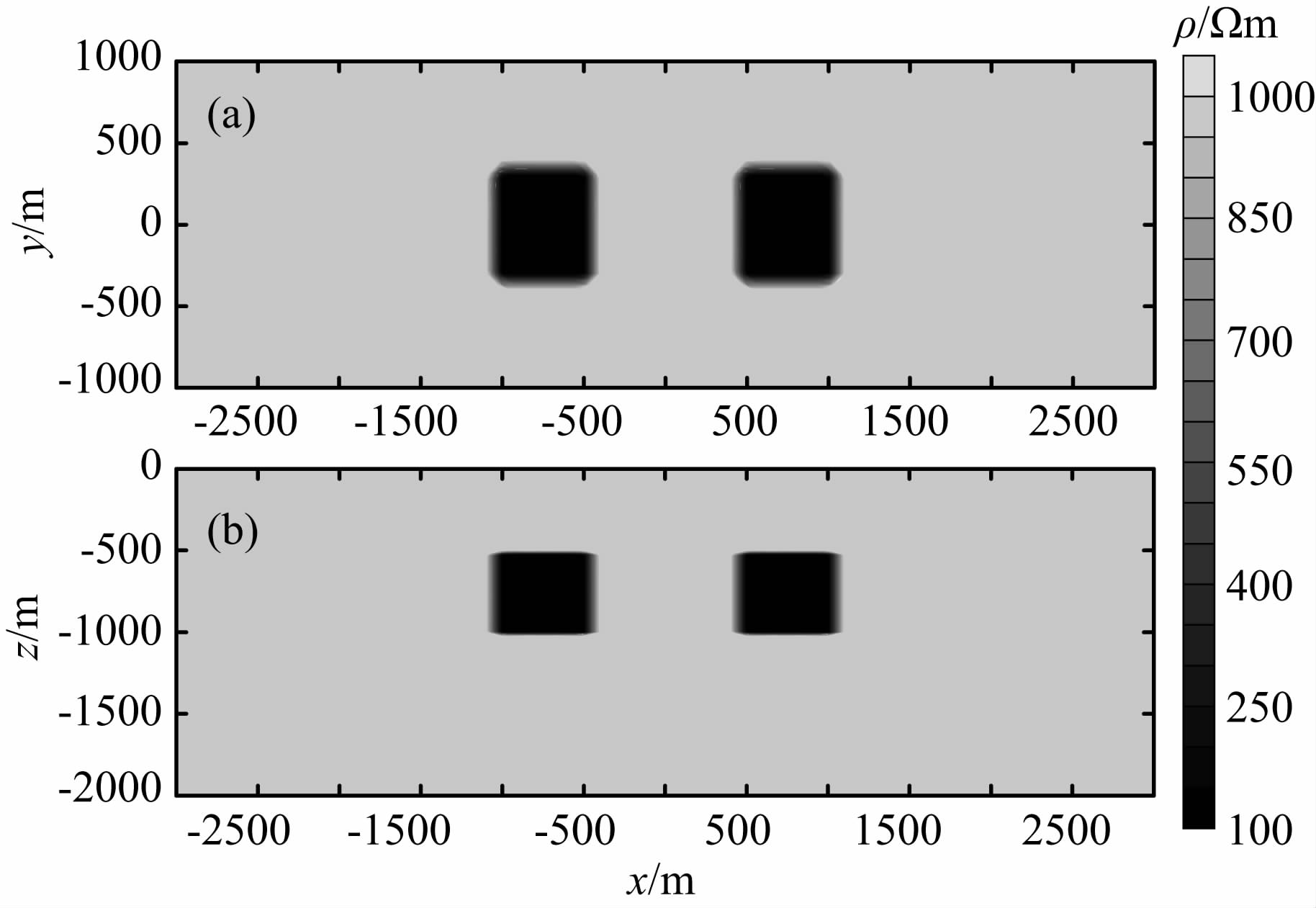 图 14 电导率连续变化的复杂模型示意图 (a)平面图;(b)断面图. Fig. 14 Schematic diagram for combined complex model with multiple 3D anomaly bodies and continuous variation of electrical conductivity around them (a)Plan view;(b)Section view. |