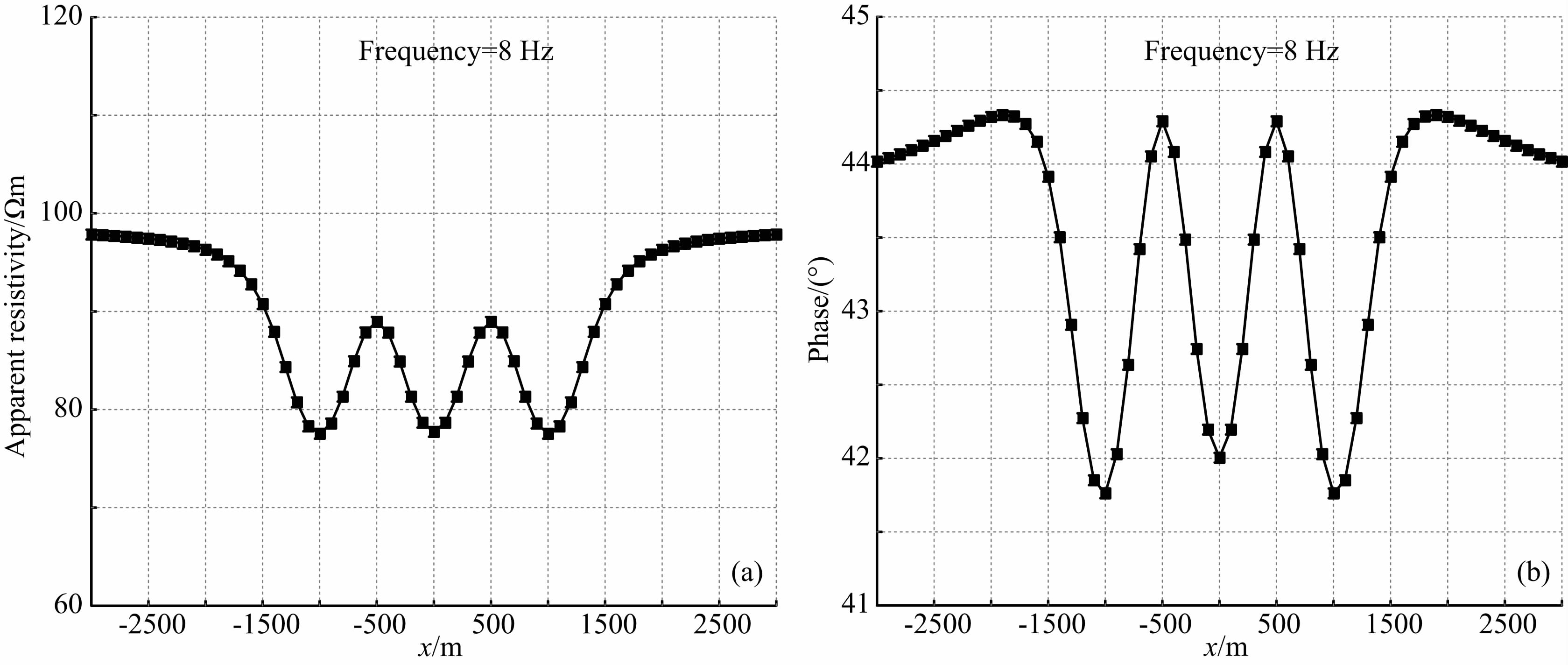 图 15 8 Hz时正演模拟结果 (a)视电阻率曲线图;(b)相位曲线图. Fig. 15 The apparent resistivity and phase curve for combined model with multiple 3D anomaly bodies (a)Apparent resistivity;(b)Phase. |