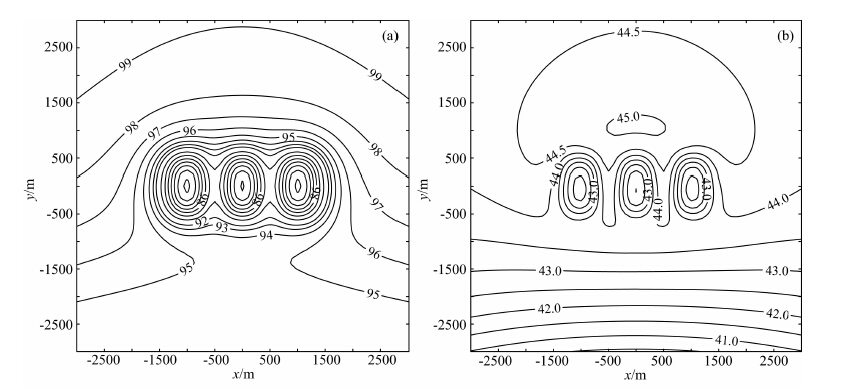 为了模拟电导率连续变化的复杂地质情况异常特征,图 14为电阻率100 Ωm均匀半空间中有电阻率分别为20、500、20、500、20 Ωm 5个相间的异常体,在x、y、z方向的长度均分别为400、800、400 m,埋深均为200 m,其周边介质的电阻率同样显示为 渐变.图 14a表示地下异常体在地表的投影,图 14b表 示 y=0断面(x=-3000~3000 m,z=-2000~0 m)的电阻率分布,发射源Tx(长度和电流强度分别为1000 m和30 A)位于网格外延区域,其方向与x轴平行,中心点的坐标为(0、-12000、0)m.图 15是电偶极子发射频率为8 Hz时地表y=0剖面(x=-3000~3000 m,z=0)的视电阻率曲线和相位曲线,图 16是电偶极子发射频率为8 Hz时地表的视电阻率等值线和相位等值线,由图可以看出,数值模拟结果反映了异常体高低阻相间的特性,与地下异常体的分布相吻合.