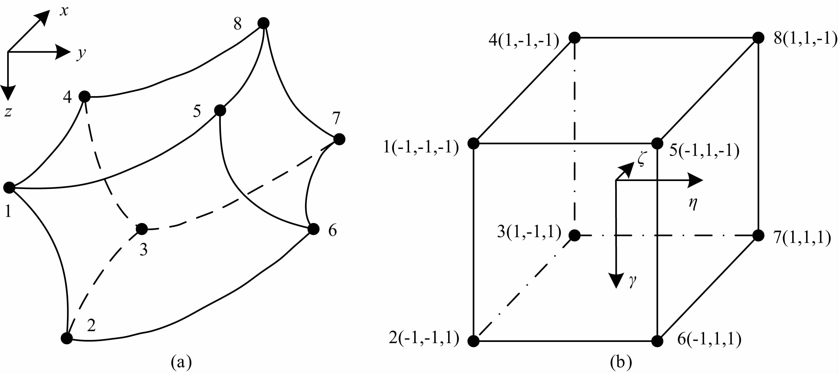 图 2 任意形状的六面体单元示意图 (a)子单元;(b)母单元. Fig. 2 Schematic diagram for an arbitrary hexahedral element (a)Sub-element;(b)Parent element. |