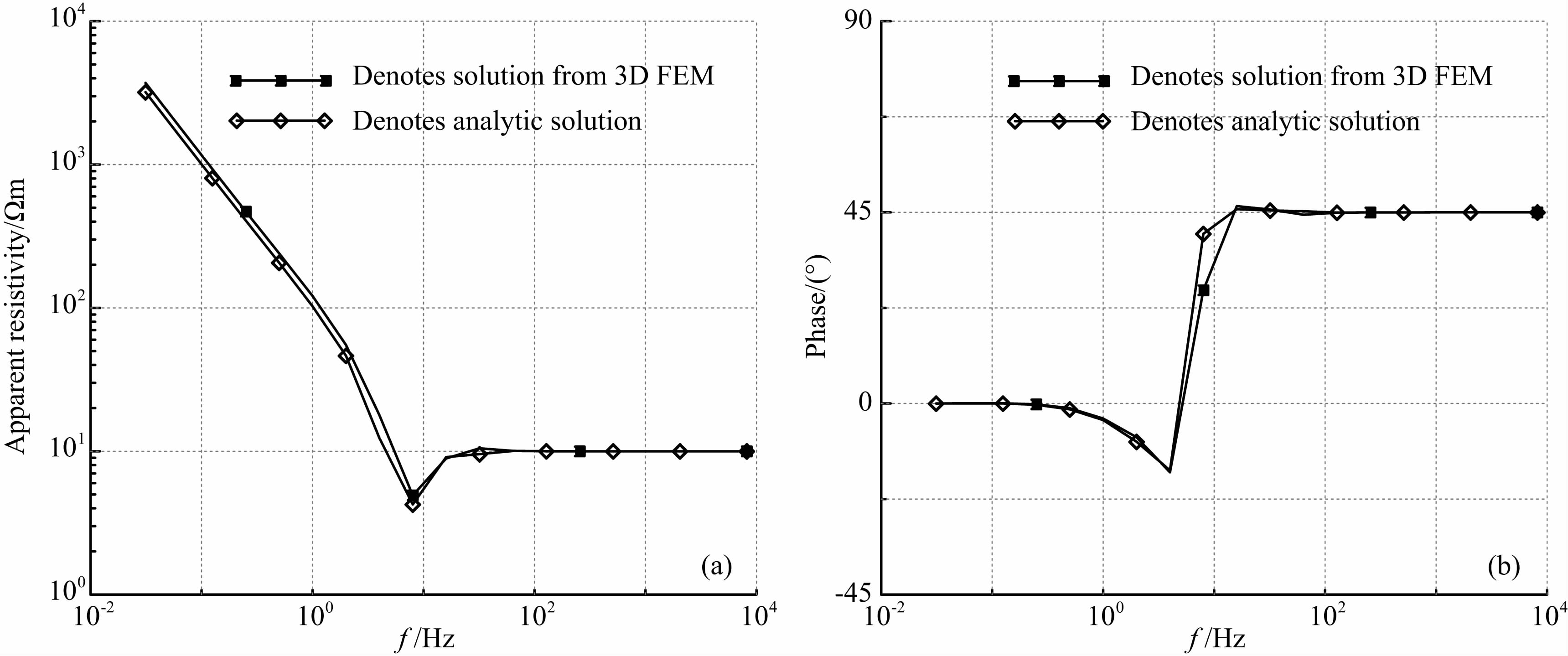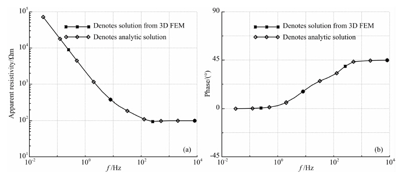 图 8 水平层状一维介质模型三维有限单元计算结果与解析解结果对比 (a)视电阻率;(b)相位. Fig. 8 Comparison between the analytical and 3-D FEM solutions for 1D stratified models (a)Apparent resistivity;(b)Phase. |