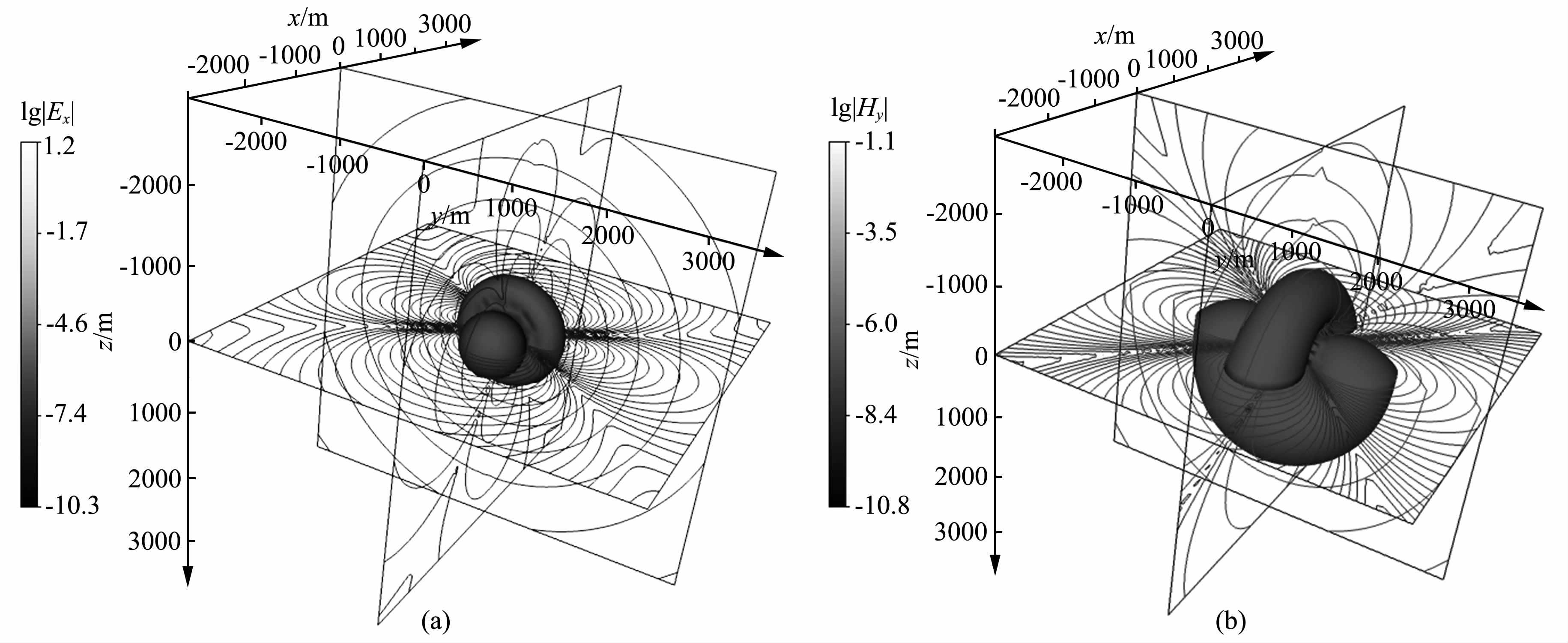 由公式(28)、(29)计算得到视电阻率相对误差Xρxy和相位误差Xφxy分别为0.002%和0.0005°,三维有限元计算结果与解析解在很宽的频段上均吻合非常好.图 5还给出频率2 Hz的电场Ex和磁场Hy振幅全空间分布,可以直观地看到,地表的 Ex和Hy 呈4个花瓣状的图案,4个花瓣被4个低值带所分开,为可能的三维全空间测量提供参考.