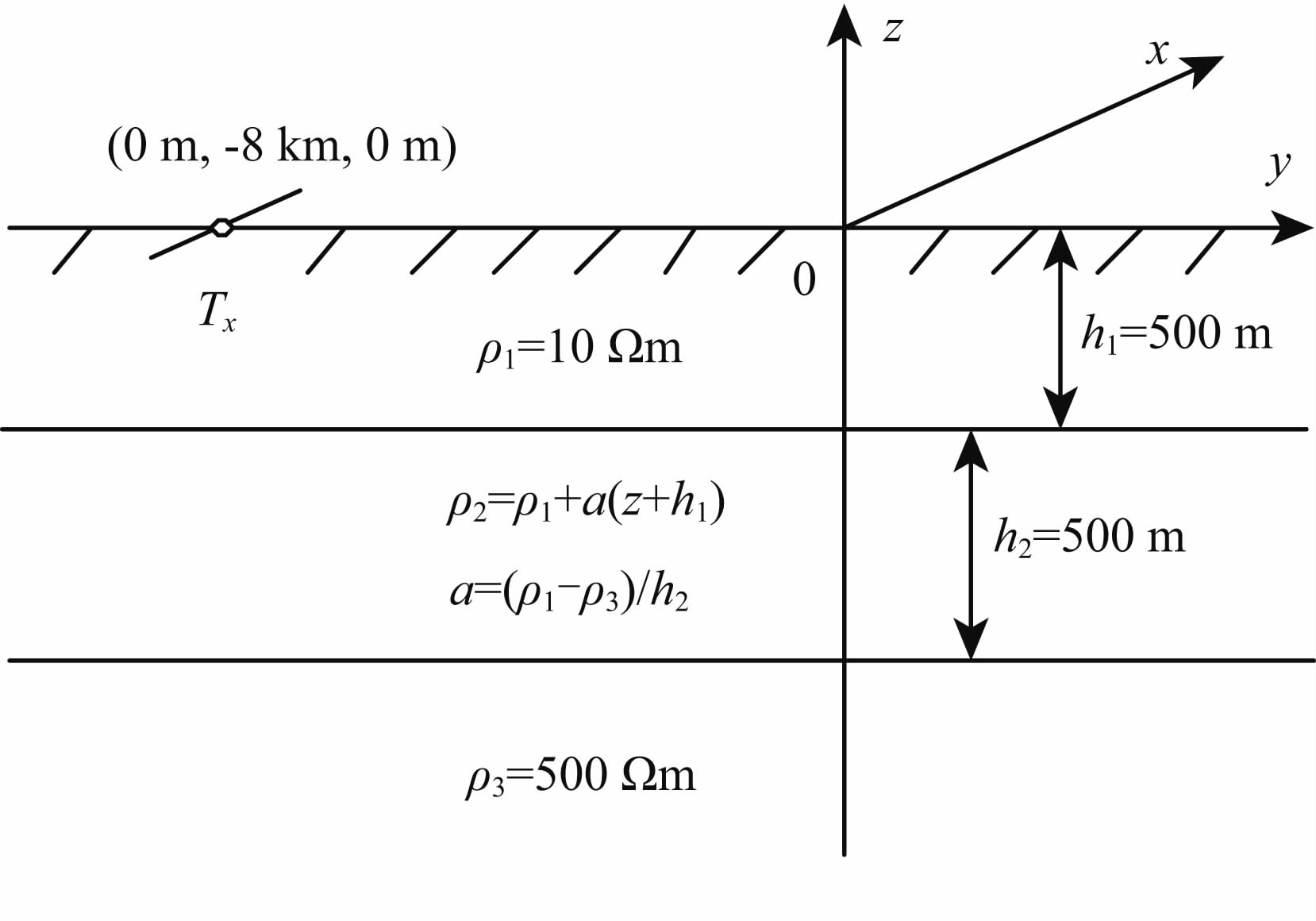 水平层状一维连续介质模型如图 6所示.发射源长度和电流强度分别为1000 m和30 A的电偶 极子Tx位于网格外延区域,Tx中点坐标为(0、-8000、 0)m,其方向平行于x轴.第一层电阻率为10 Ωm,厚度为500 m,第三层电阻率为500 Ωm,第二层为电阻率连续变化介质,厚度为500 m,电阻率随着深度 线性增加,其电阻率变化如图 7a所示,该模型目前 未见到解析解,可由本文的有限元方法计算.图 7b是对应的三层电阻率均匀模型,有解析解,其第一层和第三层电阻率与图 7a相同,中间层厚度仍为500 m,但电阻率为第一和第三层电阻率的对数平均值,以近似图 7a的线性变化.分层连续变化模型在原点的视电阻率和相位与三层均匀模型的解析结果比较见表 2,相应的视电阻率和相位曲线如图 8所示.可以看出,分层连续变化介质模型与均匀模型的视电阻率曲线和相位曲线形态基本一致,但在某些频点上差异较大,视电阻率差异最大可达44.43%,相位差可达13.27°,而且在低频的视电阻曲线上产生了 系统偏差,表明电阻率连续变化相对电阻率均匀层 状模型有明显影响.如果实际地下岩石电阻率为连续变化,而依然采用传统的分层均匀模型进行解释,显然会造成较大的误差,值得引起重视.