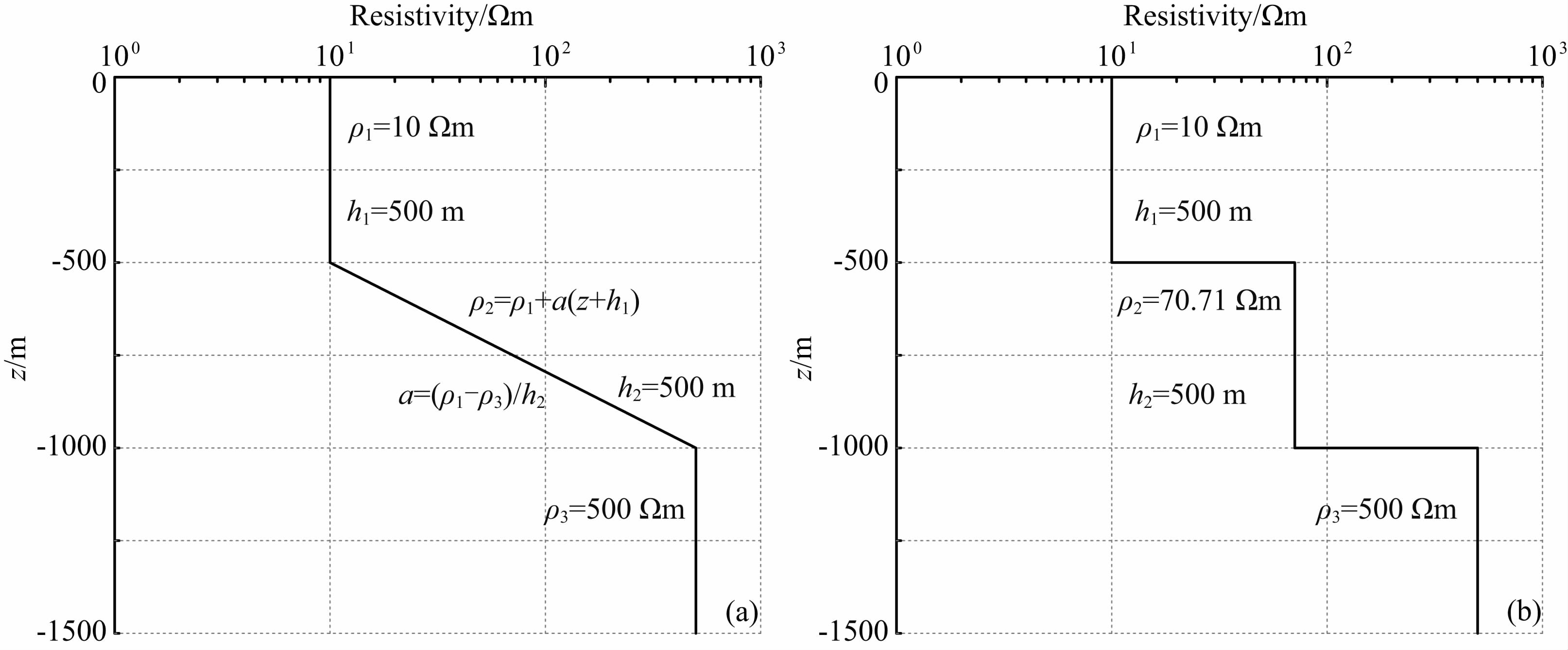 图 7 水平层状一维介质模型电阻率分布 (a)介质分层连续变化模型;(b)三层均匀介质模型. Fig. 7 Distribution of resistivity for 1D stratified models (a)Continuous variation of resistivity;(b)Step variation of resistivity. |