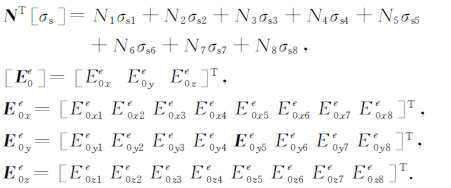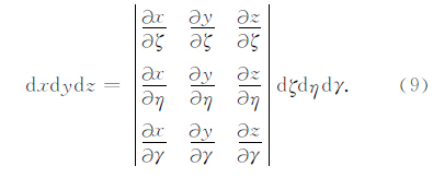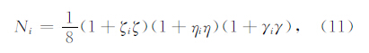 求解过程中,常规立方体剖分时单元积分得到矩阵中的各个元素为常数(徐世浙,1994).而采用任 意形状的六面体剖分,其单元积分需要用等参变 换来处理,把式(9)代入式(20)将形成形如