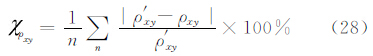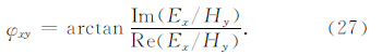 求得 Esx z和Esz x 后代入式(25)便可计算出地面上节点的二次磁场值Hsy,加上由解析解计算的一次磁场值H0y获得各节点上的总磁场Hy,便可用下式分别计算视电阻率ρxy和相位φxy: