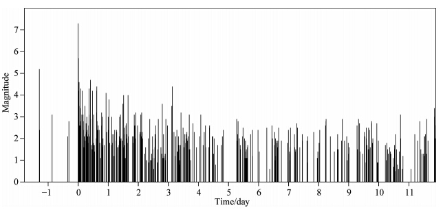![]() | 图 2 2014年新疆于田MS7.3级地震序列M-t图(横坐标的零点表示MS7.3级主震的时刻)Fig. 2 M-t diagram of aftershock sequence of 2014 Yutian MS7.3 earthquake(Zero on the x-axis indicates the occurrence time of this event) |