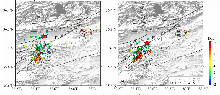 ![]() | 图 3 重定位前后的地震震中分布图 (a)新疆地震台网提供的地震震中分布图;(b)重定位后的地震震中分布图,彩色圆点表示2014年2月11号MS5.4地震之后的震中,黑色圆圈表示2009年至2014年2月10日的震中,红色五角星表示MS7.3地震的震中位置,色标表示距2014年MS7.3地震的时间差,单位为 天,零时刻为于田MS7.3级地震的发震时刻,两幅图使用的地震数量相同. Fig. 3 Epicenter maps before and after relocation (a)Epicenter map determined by Xinjiang Seismic Network;(b)Relocated epicenter map. Color dots represent the epicenters of earthquakes occurred after February 11,2014. Black circles represent epicenters between 2009 and February 10,2014. Red star represents location of the 2014 MS7.3 event. The color is coded with time. Zero of the color scale indicate the occurrence time of February 12,2014 MS7.3 earthquake. |