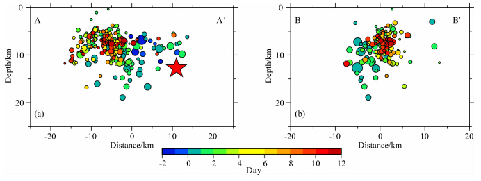 ![]() | 图 4 震源深度沿AA′和BB′剖面的分布 红色五角星表示2014年于田MS7.3级地震的位置,其余图例同图 3,每个地震到剖面轴线的距离小于4 km. Fig. 4 Focal depth cross sections along profiles AA′ and BB′ Red star is the location of the MS7.3 earthquake. The rest of the legends are the same as in Fig 3. The distance of each earthquake to the profile is less than 4 km. |