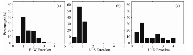 ![]() | 图 6 定位误差柱状图 (a)、(b)和(c)分别表示东西向、南北向和垂直向定位误差. Fig. 6 Histograms of earthquake location errors (a)、(b) and (c)represent east-west direction,north-south direction and vertical location errors. |