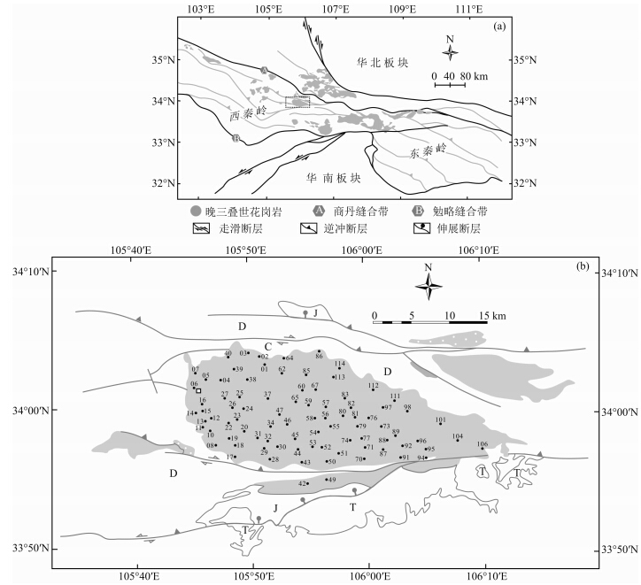 ![]() | 图 1 秦岭造山带晚三叠世岩体分布(a)及糜署岭岩体采样位置(b)Fig. 1 Distribution of the Late Triassic granite plutons in Qinling orogen(a) and the sampling sites within Mishuling pluton(b) |
