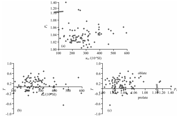此外,磁组构其他标量参数(PJ和T等)也可以用来约束岩体的内部组构特征(图 11).其中,PJ是校正磁化率各向异性度,是对样品各向异性大小的度量,多数情况下对应岩石的应变强度(Borradaile,1998).糜署岭岩体的PJ值介于1.004和1.403 之间(表 1),平均值约为1.042,绝大多数样品的值小于1.08,只有少数几个样品的值较高.这与顺磁性花岗岩较弱的磁化率各向异性特征基本一致(Tarling and Hrouda, 1993).T值是样品的磁化率椭球形态参数,往往作为岩石应变体制的指示标志(Rathore,1979; Jelinek,1981).T=0为平面应变状态,0<T<1为压扁应变状态,而-1<T<0为拉伸应变状态.由于磁铁矿单矿物的T值往往较小(-0.30),而黑云母单矿物的T值(0.95)显示为压扁应变状态,因此,糜署岭岩体绝大部分样品表现出明显的压扁椭球更多的反映了黑云母所构成的岩体矿物组构的特征,这也与上述岩石磁学和岩相学结果一致.此外,κm-PJ-T图解显示三者之间并没有明 显的协变关系,因此,岩性差异对岩体组构参数的影响较小.