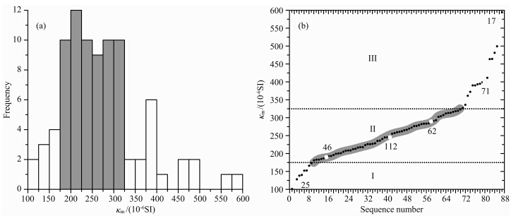 ![]() | 图 2 糜署岭岩体平均磁化率直方图(a)及磁化率值分布曲线(b) 图a,b中灰色区域表示磁化率优势区间,图b中空心圆及数字为代表性样品.Fig. 2 Histogram of mean susceptibility(a)its distribution curve of the Mishuling pluton Gray areas in Fig. 2a—2b show the dominant range of susceptibility values. Open circles with numbers in Fig. 2b are the representative samples. |