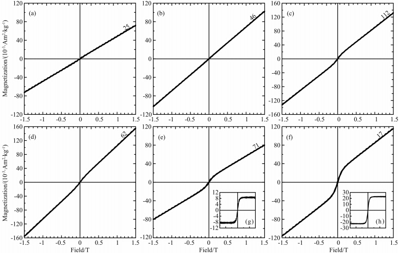 ![]() | 图 3 糜署岭岩体样品磁滞回线特征 (a—f)为初始磁滞回线;(g—h)经顺磁性矫正.Fig. 3 Hysteresis loops of representative samples of Mishuling granite pluton (a—f)are initial hysteresis loops for the samples;(g—h)are loops with paramagnetic susceptibility subtracted. |