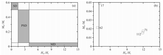![]() | 图 4 糜署岭岩体磁滞参数的Day图 图中磁滞参数的含义见正文;SD,PSD和MD分别代表单畴、假单畴和多畴磁铁矿.Fig. 4 Hysteresis ratios on Day plot of the Mishuling pluton Find the details of the hysteresis ratios in text; SD,PSD and MD represent respectively the single-domain,pseudo-single-domain and multi-domain magnetites. |