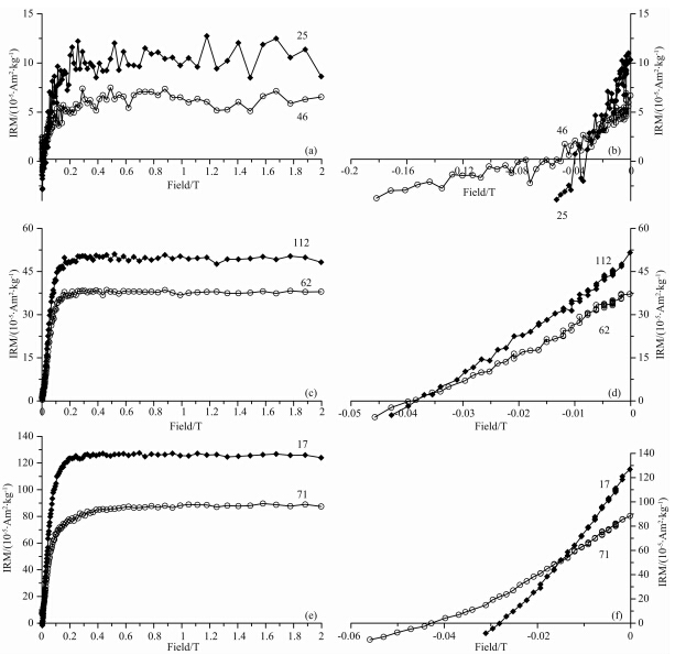 为了进一步确定样品中的载磁矿物,针对代表性样品开展了等温剩磁获得曲线和反向场退磁曲线分析(图 5).IRM获得曲线表明:几乎所有样品的IRM在外加场小于100 mT时均迅速升高,并达到SIRM的约80%~90%;在100 mT之后缓慢增加,并在300 mT前基本达到饱和;之后随着外场继续增加直至2 T,IRM几乎不再继续升高.这些特征表明,样品中以低矫顽力的软磁性组分(如磁铁矿、磁赤铁矿)为主,几乎不存在硬磁性组分(如赤铁矿、针 铁矿等).所有样品的SIRM值均较低,不超过1.5×10-3 Am2·kg-1. 其中,磁滞回线显示为顺磁性的样品(样品25和46),IRM值随外加场变化出现了明显的跳跃,SIRM值也极低,不超过1.5×10-5 Am2·kg-1(图 5a—b).表明样品中铁磁性组分的含量极低.SIRM的分步反向退磁曲线表明,所有样品的剩磁矫顽力也较小,不超过40 mT.