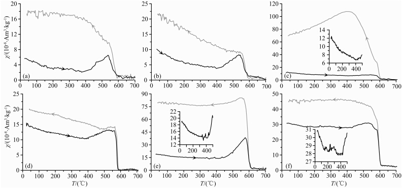 ![]() | 图 6 糜署岭岩体代表性样品的热磁曲线特征(黑色为升温曲线,灰色为降温曲线)Fig. 6 Temperature dependence of magnetic susceptibility(Dark lines show heating,whereas grey lines show cooling) |