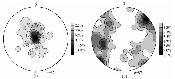 ![]() | 图 7 糜署岭岩体磁面(a)、线理(b)的极点等密度图Fig. 7 Density diagrams of magnetic foliation(a) and lineation(b) |