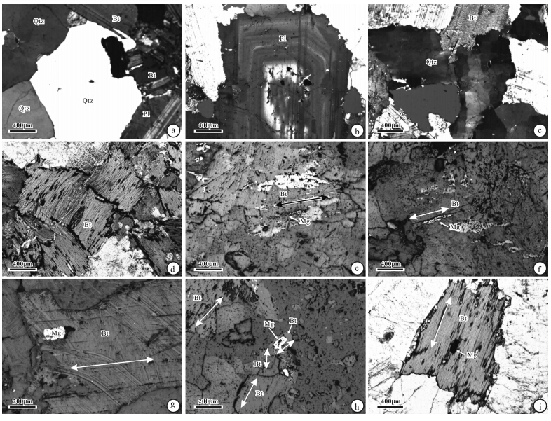 ![]() | 图 8 糜署岭岩体显微构造及不透明矿物特征 缩写符号Qtz,Bt,Pl,Mg,Ilm分别代表石英,黑云母,斜长石,磁铁矿,钛铁矿.Fig. 8 Microstructural and opaque mineral characteristics of the Mishuling pluton Qtz,Bt,Pl,Mg and Ilm represents Quartz,Biotite,Plagioclase,Magnetite and Ilmenite,respectively. |