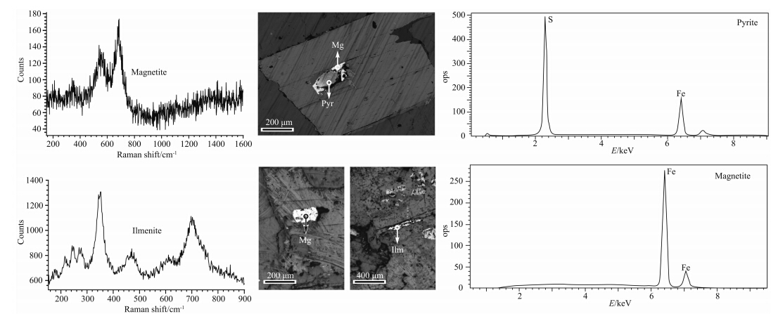 ![]() | 图 9 糜署岭岩体不透明矿物的电子探针和拉曼光谱分析 Mg,Pyr和Hm分别代表磁铁矿,黄铁矿和钛铁矿.Fig. 9 Electron microprobe and Raman spectrum analyses of opaque minerals of the Mishuling pluton Mg,Pyr and Hm are Magnetite,Pyrite and Hmenite respectively |