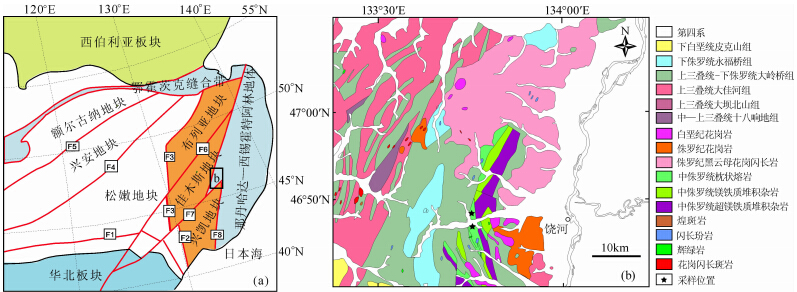 ![]() | 图 1 中国东北及俄罗斯远东地区大地构造单元划分(a)(据Zhou et al.,2011)和黑龙江省饶河地区地质图及采样位置(b) F1:西拉木伦—长春断裂;F2:延吉断裂;F3:牡丹江断裂;F2+F3:延吉—黑龙江断裂;F4:贺根山—黑河断裂;F5:新林—喜贵图断裂;F6:依兰—伊通断裂;F7:敦化—密山断裂;F8:滨海断裂.Fig. 1 Tectonic divisions of NE China and Far East Russia(a)(after Zhou et al., 2011),geological map of the Raohe area,Heilongjiang Province and sampling locations(b) F1:Xar Moron-Changchun zone; F2:Yanji Fault; F3:Mudanjiang Fault; F2+F3:Yanji-Heilongjiang Fault; F4:Hegenshan-Heihe Fault; F5:Xinlin-Xiguitu Fault; F6:Yilan-Yitong Fault; F7:Dunhua-Mishan Fault; F8:Primoria Fault. |