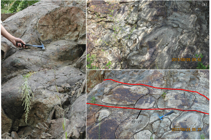 ![]() | 图 2 枕状玄武岩野外照片 (a)枕状玄武岩原地形貌;(b)枕状玄武岩风化边;(c)枕状玄武岩地层产状.Fig. 2 Pillow basalts of Middle Jurassic lava in situ (a)Morphology in situ of pillow basalts;(b)Weathering edges of pillow basalts;(c)Formation occurrence of pillow basalts. |