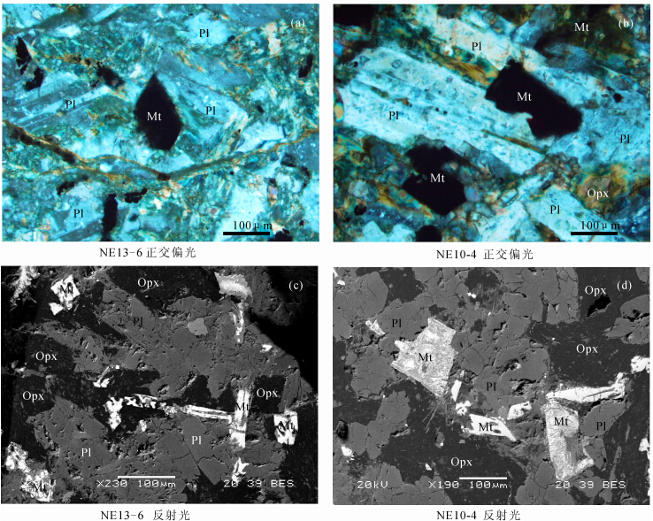 ![]() | 图 3 显微镜下典型样品结构图 其中Pl—斜长石;Opx—斜方辉石;Mt—含钛磁铁矿.Fig. 3 Structural photos of typical samples under microscope Pl-plagioclase;Opx-orthopyroxene;Mt-Titaniferous magnetite. |