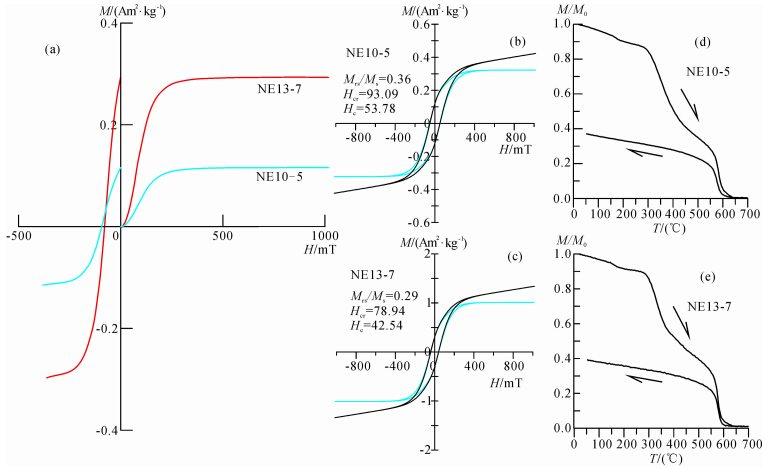![]() | 图 4 典型样品的等温剩磁获得曲线(a)、磁滞回线(b,c)、J-T曲线(d,e)Fig. 4 Behaviors of acquisition of isothermal remanent magnetization(IRM)(a),hysteresis loop(b,c), and J-T(d,e)curves for pilot samples from the Raohe areas of Heilongjiang province |