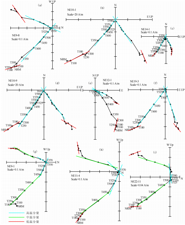 样品的热退磁试验是使用英国Magnetic Measurements公司生产的MMTD60型全自动热退磁仪,剩磁测量是用美国2G-755R型超导岩石磁力仪完成的,全部实验在零磁空间中进行.对所有样品进行逐步热退磁(热退磁温度从室温至590 ℃共12步,退磁间隔在25~50 ℃之间)表明,当退磁温度在100 ℃~250 ℃时可分离出稳定的一组剩磁组分,部分样品在250~400 ℃之间可获得第二组剩磁组分,大部分样品300~590 ℃之间可分离出第三组剩磁组分,且第二组剩磁方向和第三组剩磁组分有部分重合现象,在退磁投影图上趋于原点,第三组剩磁组分可能代表了火山岩喷发时的原生剩磁方向,第二组剩磁组分代表后期部分样品后期重磁化不够彻底的记录(图 5).