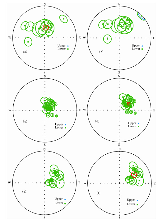 ![]() | 图 6 黑龙江饶河地区中侏罗统枕状玄武岩的特征剩磁方向及采点平均方向的95%置信椭圆的等面积投影 (a)低温特征分量地理坐标;(b)低温特征分量层面坐标;(c)中温特征分量地理坐标;(d)中温特征分量层面坐标;(e)高温特征分量地理坐标;(f)高温特征分量层面坐标;红圈为平均方向.Fig. 6 Equal-area projections of directions of characteristic remanences isolated from Middle Jurassic rocks from the Raohe areas of Heilongjiang province (a) and (b)Low-temperature component before and after tilt-correction;(c) and (d)Middle-temperature component before and after tilt-corrcetion;(e) and (f)High-temperature component before and after tilt-correction. Red circles represent the average direction. |