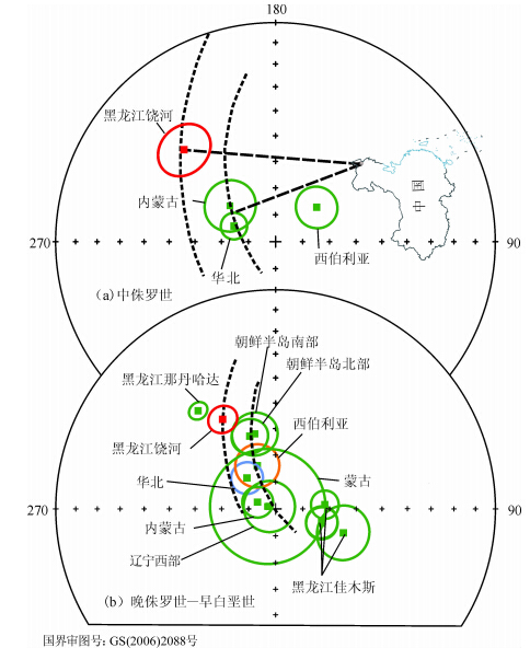 综合黑龙江饶河地区及邻区中侏罗世古地磁极数据(表 5,图 7a),分析表明内蒙古、华北在中侏罗世在95%置信度已经拼贴为一体,黑龙江饶河地区和西伯利亚地区则与上述地块有一定的距离,这与区域地质事实相符(Zhao et al.,1994),对应的古地 磁极获得的古纬度为27.6°N,与现今纬度46.8°N相差19.2°,估算距离约2000 km.