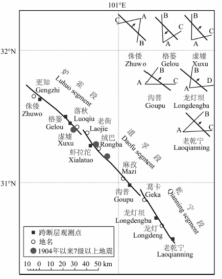 致谢 在本文前期研究过程中,曾经就鲜水河断裂西北段各个断层分段的倾向、倾角咨询过闻学泽老师.在文章修改过程中,闻学泽老师还提供了第五代区划的活动断层数据,在此表示深深的感谢!感谢两位匿名审稿人提出的宝贵建议!| [1] | Chen L C, Wang H, Ran Y K, et al. 2010. The Ms7.1 Yushu earthquake surface rupture and large historical earthquakes on the Garzê-Yushu Fault. Chinese Sci. Bull., 55(31): 3504-3509. |