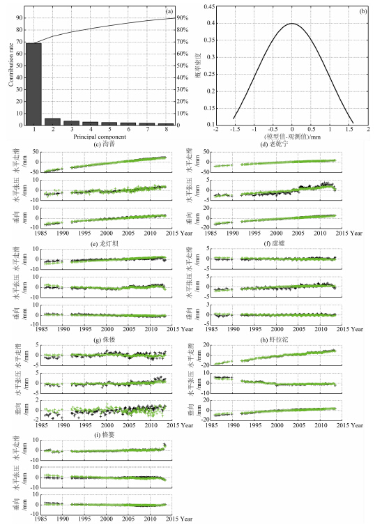用7个跨断层测点的三维观测量组成观测矩阵,得到各主成分的累积方差贡献率见图 2a.第一主成分方差贡献率占68.8%,第二主成分方差贡献率占5.9%,第三主成分方差贡献率占3.6%,其余主成分的方差贡献率很小.采用遗传算法全局搜索求解模型的最优解,最后反演的各个测站的残差符合正态分布(图 2b),各测站的观测值与模型值的比 较见图 2(c—i).断层滑动的反演中误差为:±0.1 mm.