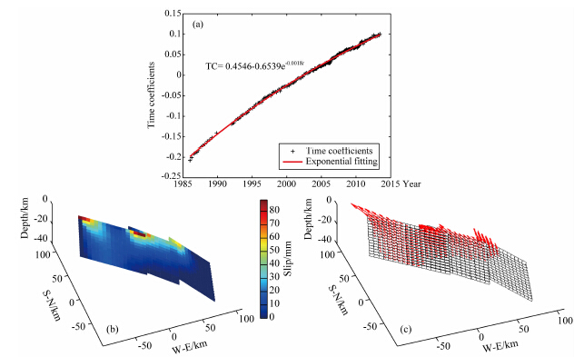 图 3 (a)第一主成分的时间系数,(b)第一主成分断层面的累积滑动量,(c)滑动方向示意Fig. 3 (a)Time coefficients of the principal component 1#,(b)Fault cumulative slip of the principal component 1#,(c)Slip direction sketch map |