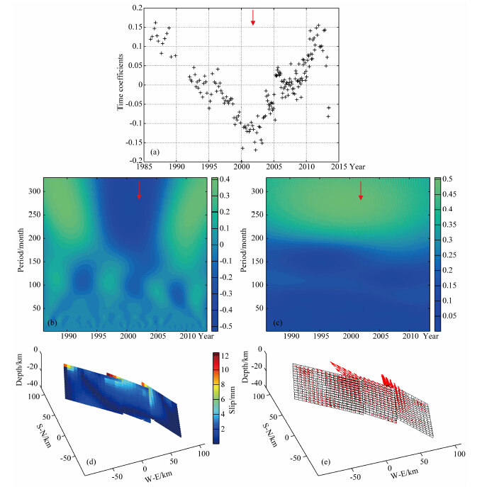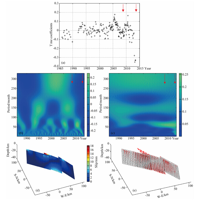 图 5 (a)第三主成分的时间系数,(b)第三主成分时间系数的复小波实部,(c)第三主成分时间系数的复小波模,(d)第三主成分在断层面上的累积滑动量,(e)滑动方向示意 红箭头为汶川M8.0地震、芦山M7.0地震.Fig. 5 (a)Time coefficients of the principal component 3#,(b)Complex wavelet real part of the principal component 3# time coefficients,(c)Complex wavelet modulus of the principal component 3# time coefficients,(d)Fault cumulative slip of the principal component 3#,(e)Slip direction sketch map Red arrow: Wenchuan M8.0,Lushan M7.0. |