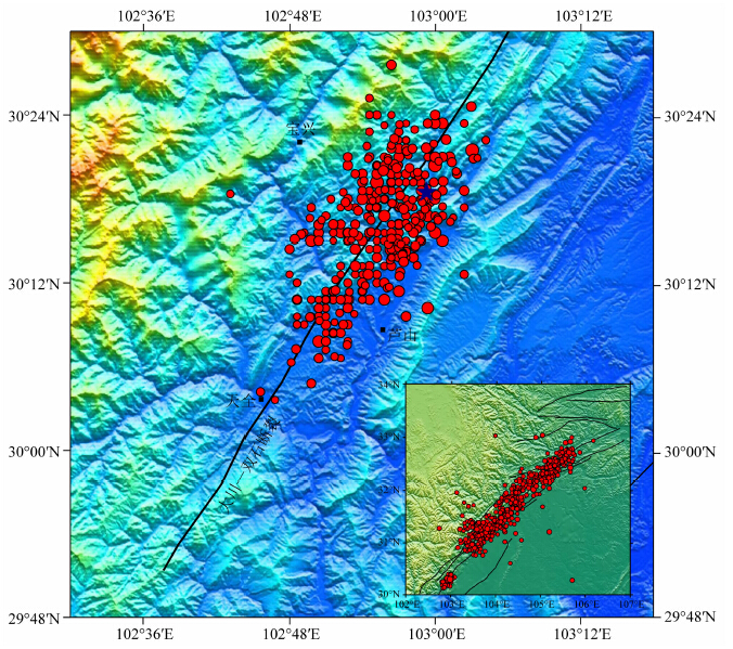 ![]() | 图 1MS7.0芦山地震震中位置及其余震序列分布. 统计时间为2013年4月20日到2014年5月25日, 震级ML≥3.5 蓝色五角星为主震震中位置,红色圆点为余震位置. Fig. 1Map of the location of MS 7.0 Lushan earthquake and its aftershocks distribution from the mainshock to May 25, 2014 for ML≥3.5 Blue star indicated epicenter location of the mainshock, and red dots indicated aftershock locations. |