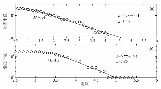 此外,由于在主震发生后的数小时内中低震级余震的数目缺失,我们必须求出在主震后短时间内最小完备震级(minimum magnitude of complete recording),Mc.过高的Mc有可能导致一些可用数据的丢失,而如果低估了Mc则会得到错误的地震活动性参数值,从而导致分析中出现偏差(Mignan and Woessner,2012).Mc通常可由古登堡-里克特(G-R)定律拟合观测到的震级-频度分布(FMD)来估计,并且取两者相符部分的起始震级作为Mc的估值(Zúniga and Wyss,1995).表 1给出了主震后半小时内(~0.02 day)余震序列目录(中国地震台网中心,2014).