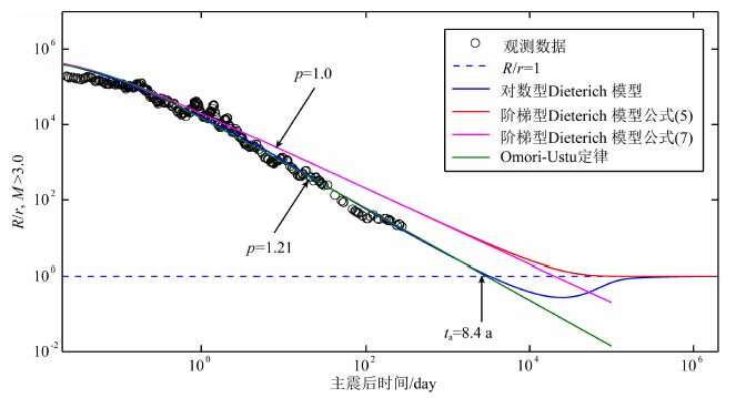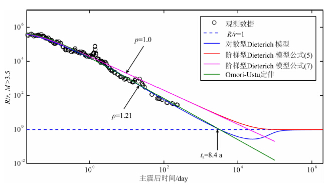 Dieterich(1994)发现浅源地震的余震持续时间ta在10.2年左右,Parsons(2002)的研究发现全球范围内主震诱发的余震持续时间ta约为7~11年.在图 3和图 6中,对数型Dieterich模型和Omori-Ustu定律预测的ta值为8.4年,这一值与上述结果十分接近,而阶梯型Dieterich模型的结果明显过大.另外从图中还可以看到,在衰减到背景场地震发生率r后,对数型Dieterich模型预测R会继续衰减一定时间,然后又逐渐增加恢复到背景场水平,也就是说在主震发生8.4年后研究区域有可能出现地震发生率低于背景场水平的现象,形成地震空区,而阶梯型Dieterich模型则不能有效解释地震空区现象.