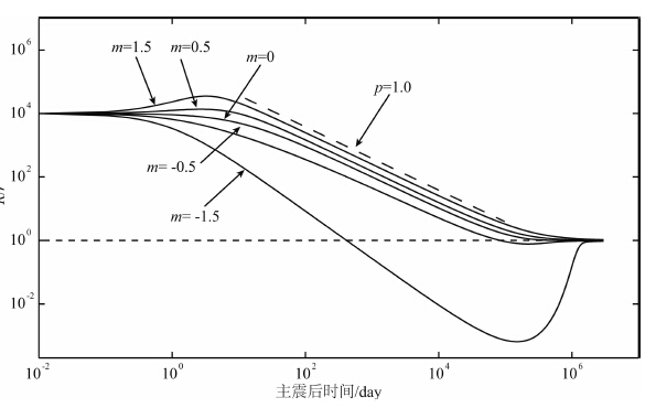 0>0,表示应力加载,在这种情况下主震后的余震发生率R先增加到一个峰值然后再衰减,并且衰减指数p=1;当m=0时,