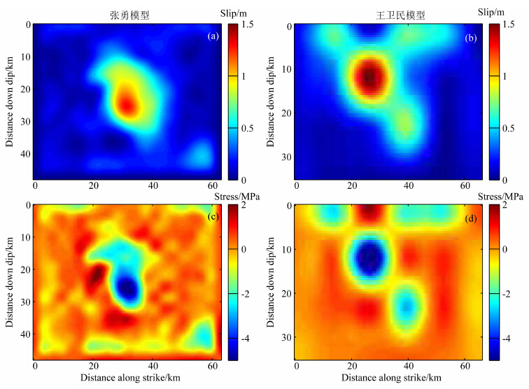 r,显然如果同时调整五个参数来拟合实际观测数据会有很大难度,因此我们先确定其中几个参数的值.利用快速傅里叶变换方法(Ripperger and Mai,2004),我们根据张勇等(2013)和王卫民等(2013)给出的MS7.0芦山地震滑移模型计算了主震后断层面上的静态应力变化,如图 5所示.Helmstetter和Shaw(2006)指出主震后短时间内余震发生率的激增主要是受最大应力变化影响而非平均应力变化,这里所说的应力变化均为应力增加,即应力变化为正,因为只有在应力变化为正的区域才有可能产生余震.无论是张勇模型还是王卫民模型我们得到最大应力变化Δτ≈2.0 MPa.另外,背景 场剪应力变化率