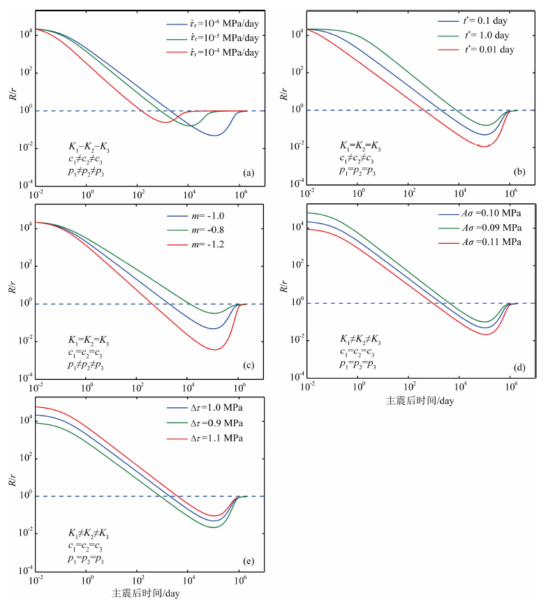 ![]() | 图 7不同参数对对数型Dieterich模型余震衰减特征的影响 Fig. 7Comparison of the decay for afterslip triggering Dieterich Model based on different parameters |