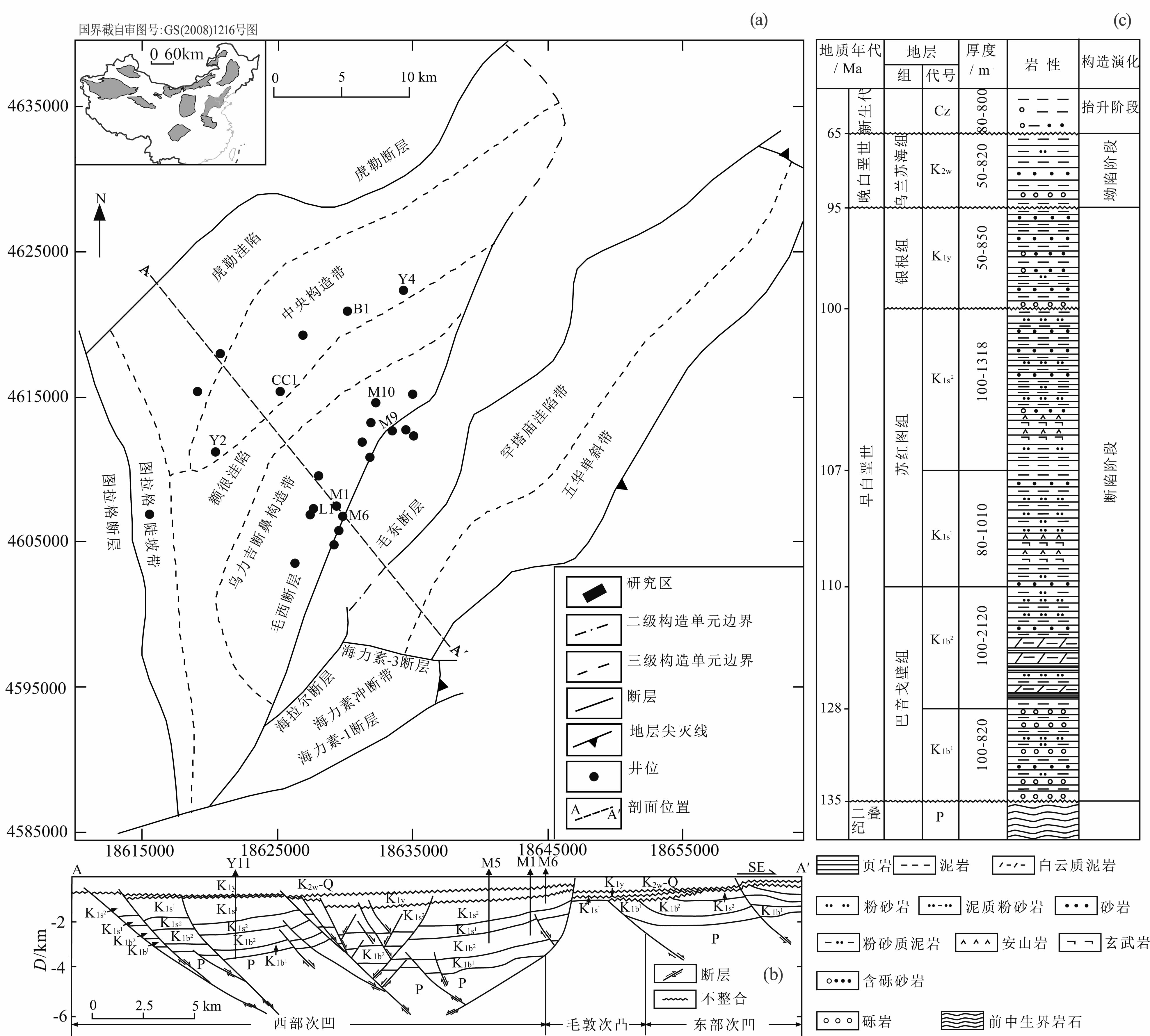 图 1 查干凹陷构造分区图(a);构造剖面图(b);地层柱状图(c) Fig. 1 (a)Structural unit division of the Chagan sag;(b)Structural profile map;(c)Stratigraphic column map |
