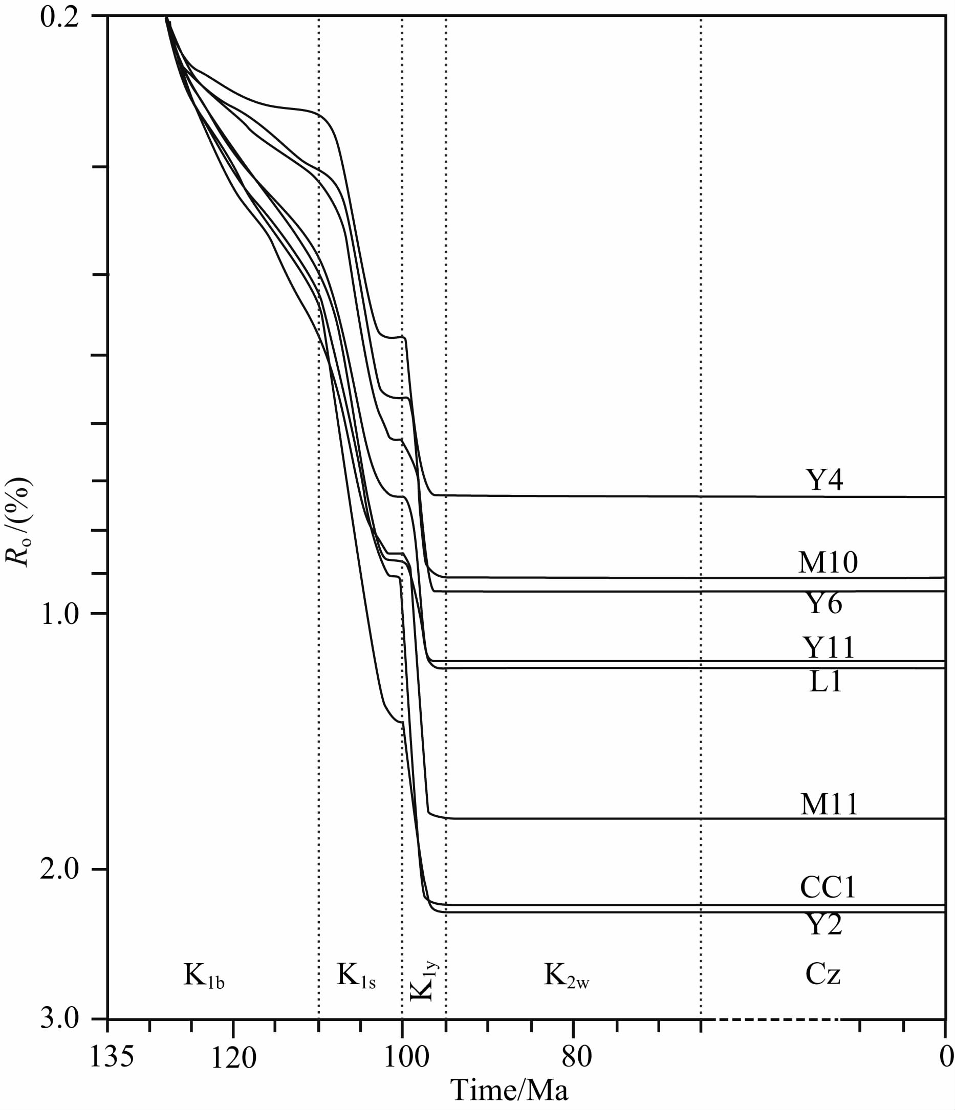图 10 查干凹陷典型井巴二段烃源岩底成熟度演化历史 Fig. 10 Maturation history of the bottom of the Bayingebi 2 Formation in the Chagan sag |