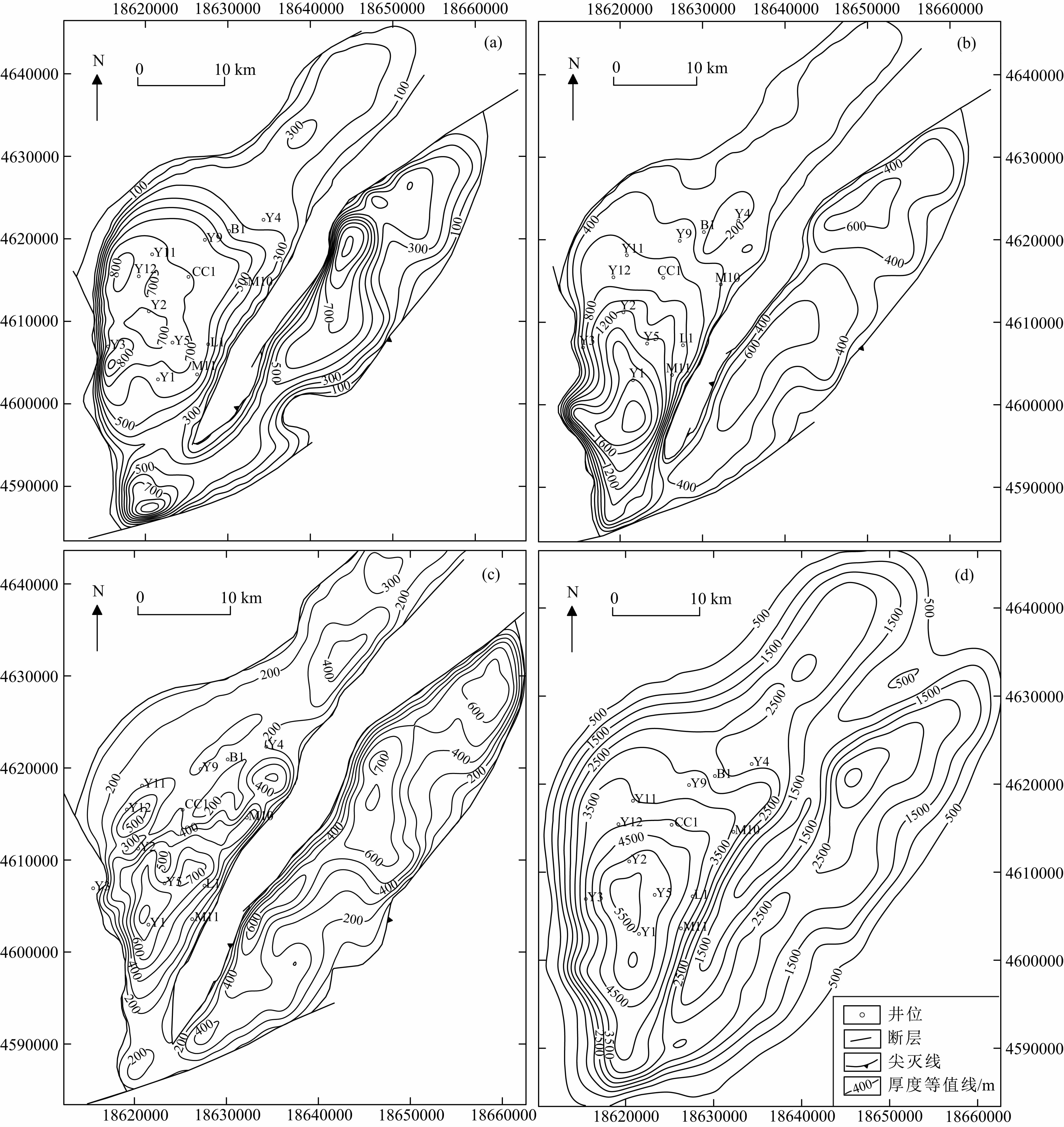 图 2 查干凹陷主要地层厚度图(a-c)及沉积盖层厚度图(d) (a)苏一段;(b)巴二段;(c)巴一段. Fig. 2 Isopach map of the main strata(a-c) and sedimentary cover of the Chagan sag(d) (a)The 1st member of Suhongtu Formation;(b)The 2nd member of Bayingebi Formation;(c)The 1st member of Bayingebi Formation. |