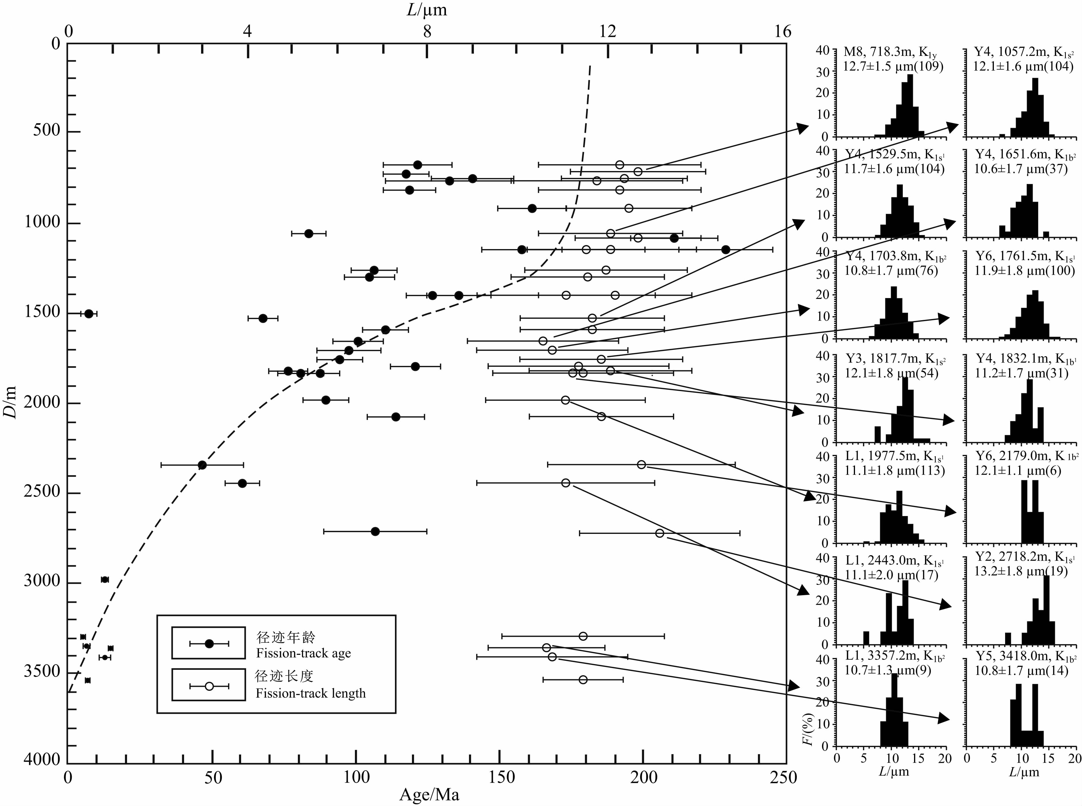 图 4 查干凹陷磷灰石裂变径迹与深度的关系(F为频率) Fig. 4 Apatite fission-track age and length versus depth in the Chagan sag |