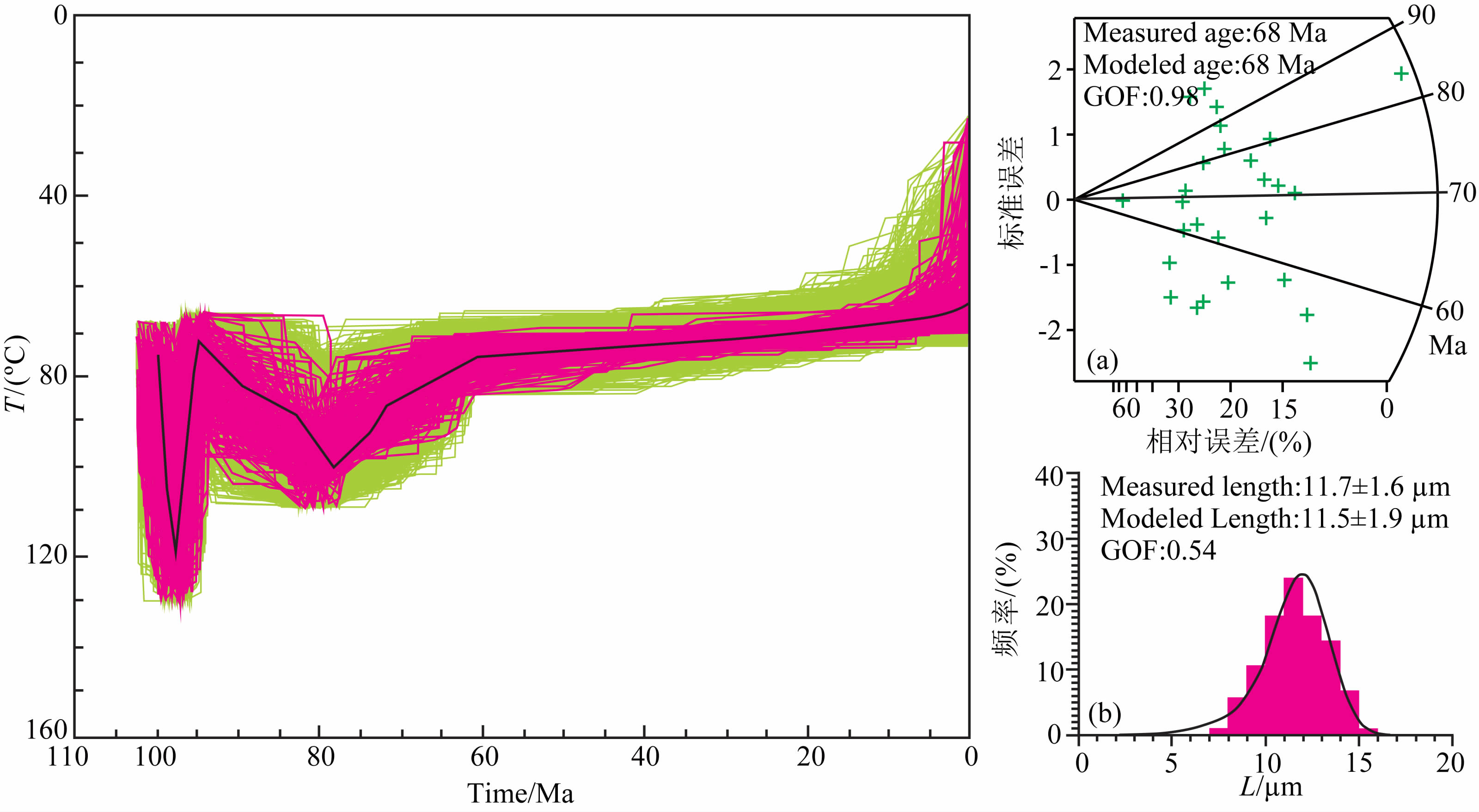 图 5 Y4井(1529.5 m,K1s1)温度-时间演化图 使用Monte Carlo模型模拟了10000条温度-时间路径;可以接受的温度-时间路径有1668条(左图酒绿色线条);好的温度- 时间路径为189条(左图粉红色线条);粗的黑线条为最佳温度-时间路径.(a)裂变径迹年龄分布图;(b)裂变径迹长度分布图, 图中黑线条为模拟的裂变径迹.GOF为拟合度. Fig. 5 Thermal history of sample Y4(1529.5 m,K1s1)in well Y4 Ten thous and thermal paths were tried using the Monte Carlo inverse modeling method;1668 paths are acceptable(wine green lines) and 189 paths are good(pink lines).The thick black line is the best temperature path.(a)Apatite fission-track ages.(b)Apatite fission-track length distribution.The thick black line is modeled Apatite fission-track length.GOF=goodness of fit. |